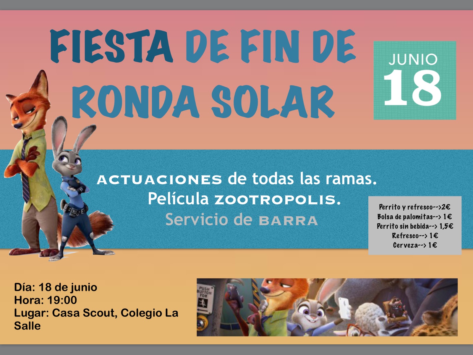 Buenas tardes a todos! Este sábado no vamos a tener actividades por ramas PEEERO vamos a tener una actividad pero que muy especial. Este fin de semana vamos a celebrar el fin de la Ronda Solar 2015-2016 y lo vamos a hacer a lo grande! Pero para hacerlo necesitaremos asistencia de todas las Ramas y los padres! No lo perdáis porque habrá actuaciones de todas las ramas, vamos a ver película “Zootropolis” y además habrá servicio de barra!!!